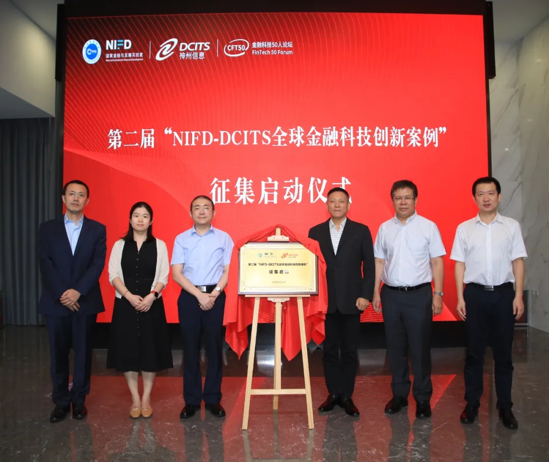 压轴环节,由神州信息董事长郭为,国家金融与发展实验室副主任、CFT50学术委员杨涛,北京金融局金融科技处副处长韦雪蕊,CFT50青年成员、光大科技创新总监兼战略发展部总经理王硕,CFT50学术成员、中关村互联网金融研究院院长刘勇、神州信息副总裁马洪杰为第二届“NIFD-DCITS全球金融科技创新案例”征集启动仪式揭幕。国家金融与发展实验室副主任、CFT50学术委员杨涛公布了“首届全球金融科技创新案例库”的入选名单。