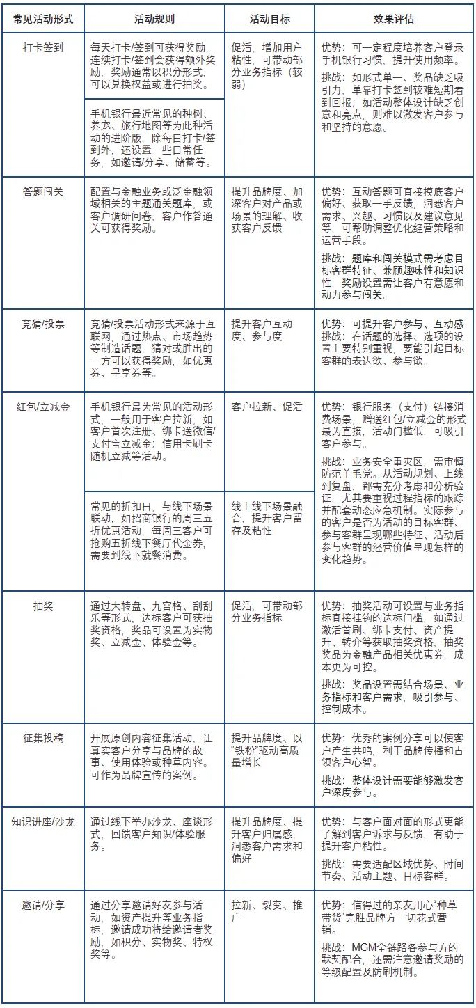 不同活动形式可以带来不同的营销效果。我们把适合在手机银行开展的、常见的活动形式及其规则、目标、效果、优势和挑战等总结梳理在(表1)供大家参考使用:
